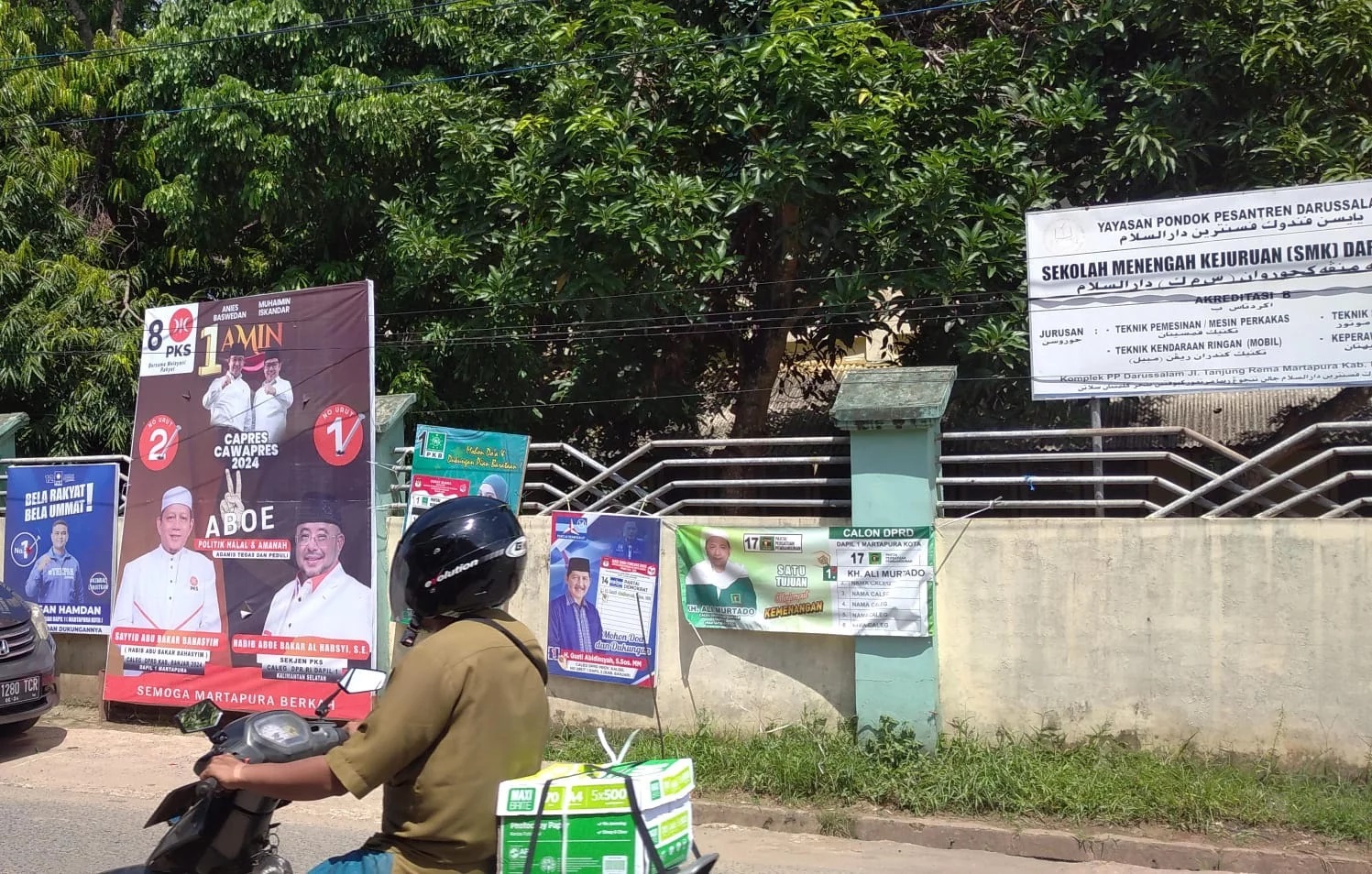 Bahkan, penempatan APK yang melanggar ketentuan PKPU, yakni di tempatkan di pohon juga didapati di beberapa titik samping ruas Jalan Ahmad Yani di wilayah Kecamatan Astambul, hingga di Desa Pasar Jati.