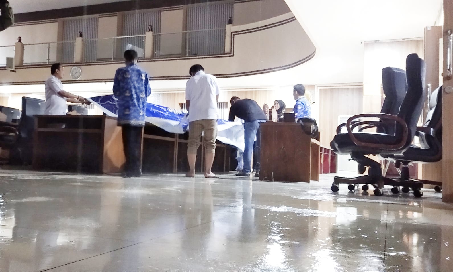 Link, Martapura –  Diduga tak kuat menahan tekanan angin kencang karena lapuk termakan usia, atap gedung DPRD Kabupaten Banjar terlepas dari kaso berbahan kayu saat diguyur hujan deras. Akibatnya  Banjir terjadi di lingkungan gedung DPRD Banjar. tepatnya pada Rabu (1/10/2025) sekitar pukul 14.00 Wita, ruangan ruang sound system dan ruang rapat paripurna Anggota DPRD Kabupaten Banjar banjir air hujan.