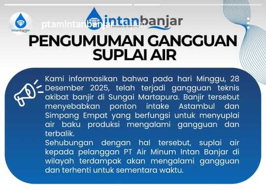 Link,Banjarbaru – PT Air Minum Intan Banjar (Perseroda) mengumumkan terjadinya gangguan suplai air bersih kepada pelanggan akibat gangguan teknis yang dipicu oleh banjir di Sungai Martapura.