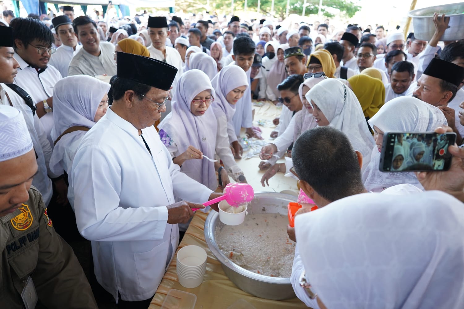 “Alhamdulillah, kita bersyukur kepada kehadirat Allah SWT dapat berkumpul pada peringatan 10 Muharram 1446 Hijriah. Gubernur Kalimantan Selatan atau Paman Birin kembali melaksanakan syukuran dengan bubur asyura,” ucap Guru Hasanuddin di atas podium.