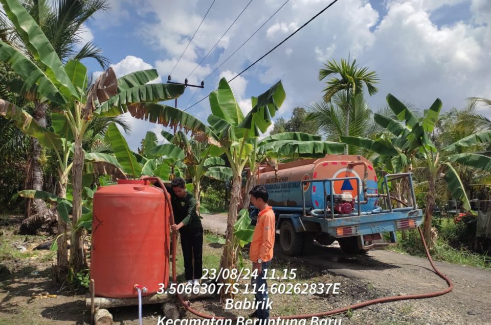 Lanjut pada siang harinya suplai air bersih juga dilakukan oleh tim gabungan ke Pondok Pesantren Takhashush Diniyah Desa Kampung Baru, Kecamatan Beruntung Baru.