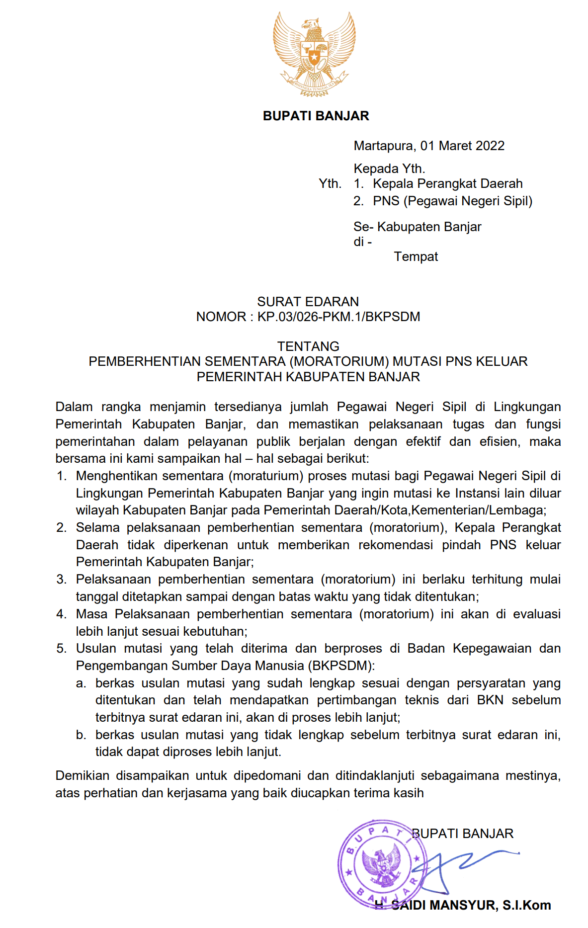 Bupati Banjar Terbitkan SE Moratorium Mutasi