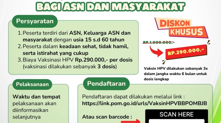 Link, Banjarbaru – Balai Besar Pengawas Obat dan Makanan (BBPOM) di Banjarbaru bersama Korps Pegawai Republik Indonesia (KORPRI) dan Dharma Wanita Persatuan (DWP), akan menggelar program sejuta vaksin Human Papillomavirus (HPV) atau vaksin kanker serviks bagi aparatur sipil negara (ASN) dan masyarakat umum. Pelaksanaan vaksinasi ini dijadwalkan berlangsung pada Kamis (29/1/2026).