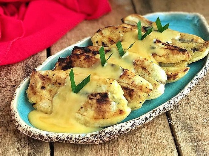 Lembut manis pisang bakar semakin enak disiram saus durian yang creamy wangi.
