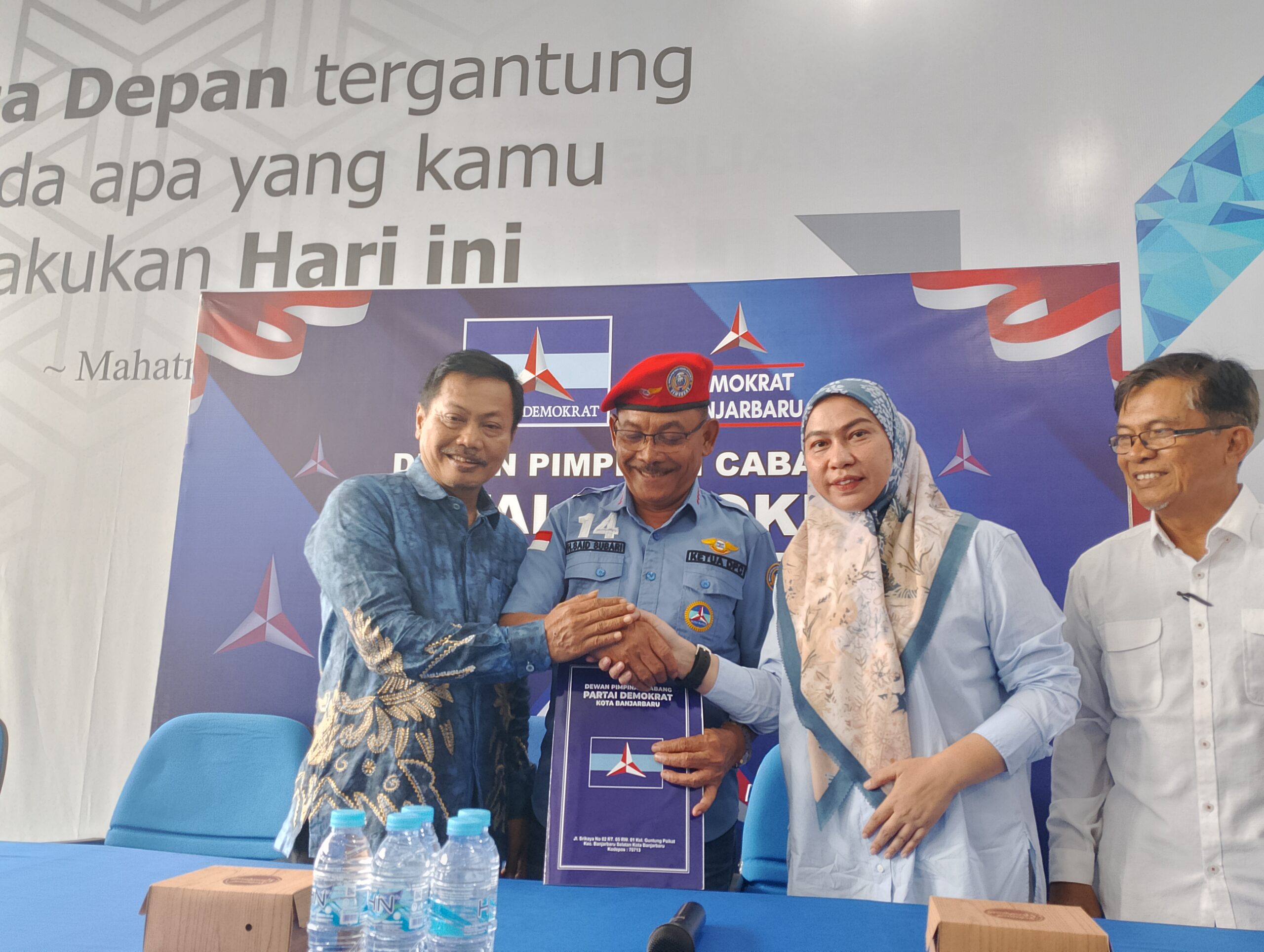 Link, Banjarbaru – DPC Partai Demokrat berikan SK dukungan sekaligus deklarasi untuk Bakal Calon Walikota Banjarbaru Erna Lisa Halaby (ELH), dan Bakal Calon Wakil Walikota Banjarbaru Wartono, di Sekretariat DPC Demokrat Banjarbaru, Sabtu (24/8/2024).