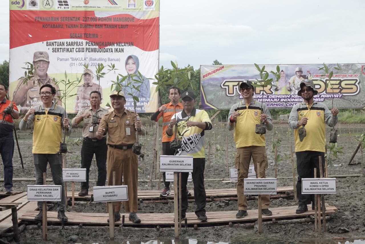 Link, Kotabaru- Masih dalam rangka Turdes ke 10, Gubernur Kalimantan Selatan Sahbirin Noor menggerakkan Penanaman Serentak 237.000 Pohon Mangrove dan Penyerahan Bantuan Sarana dan Prasarana Penangkapan Nelayan serta Penyerahan Sertifikat CBIB Pembudidayaan Ikan di Desa Sigam, Kecamatan Pulau Laut Sigam, Kabupaten Kotabaru, Selasa (2/07) siang.