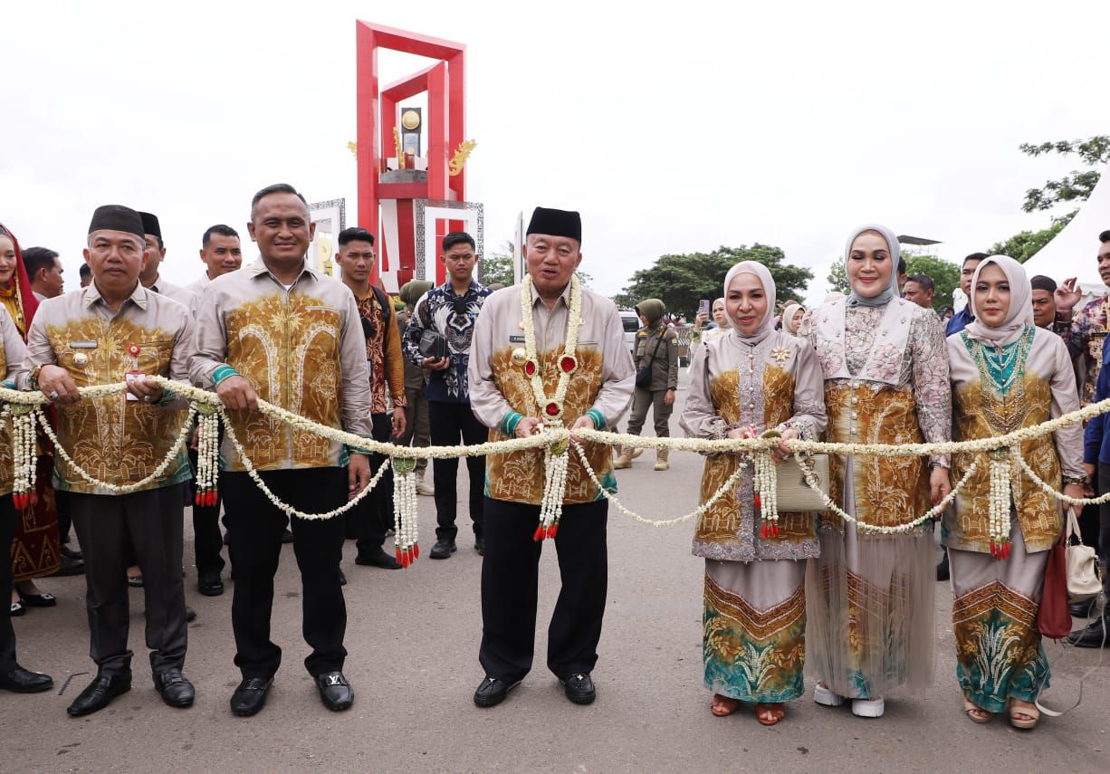 Selepas membagikan wadai, H. Muhidin meresmikan Expo Tapin 2024 dengan pemotongan pita didampingi istri Hj. Fathul Jannah, Pj. Bupati Tapin dan Wakapolda Kalsel.