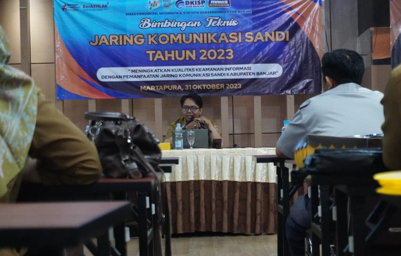 Link, Martapura – Dinas Komunikasi Informatika Statistik dan Persandian (DKISP) Kabupaten Banjar menggelar Bimbingan Teknis (Bimtek) Jaring Komunikasi Sandi tahun 2023, di Aula Baiman Lantai III Bappedalitbang, Martapura, Selasa (31/10/2023) pagi.