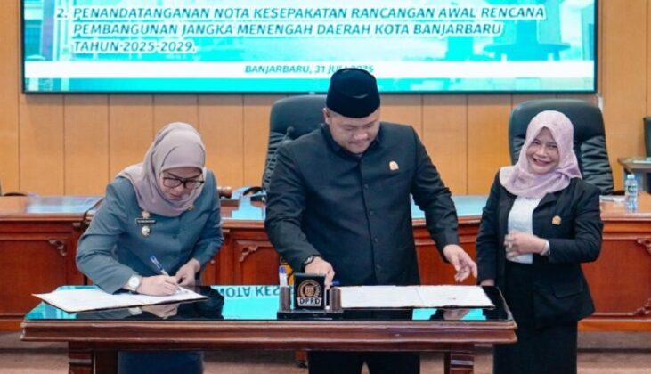 Link, Banjarbaru – Dua agenda penting yakni pengambilan keputusan terhadap Rancangan Peraturan Daerah (Raperda) tentang Perubahan APBD TA 2025 dan Penandatanganan nota kesepakatan rancangan awal Rencana Pembangunan Jangka Menengah Daerah (RPJMD) 2025-2029, digelar DPRD Kota Banjarbaru, Rabu (31/7/2025).