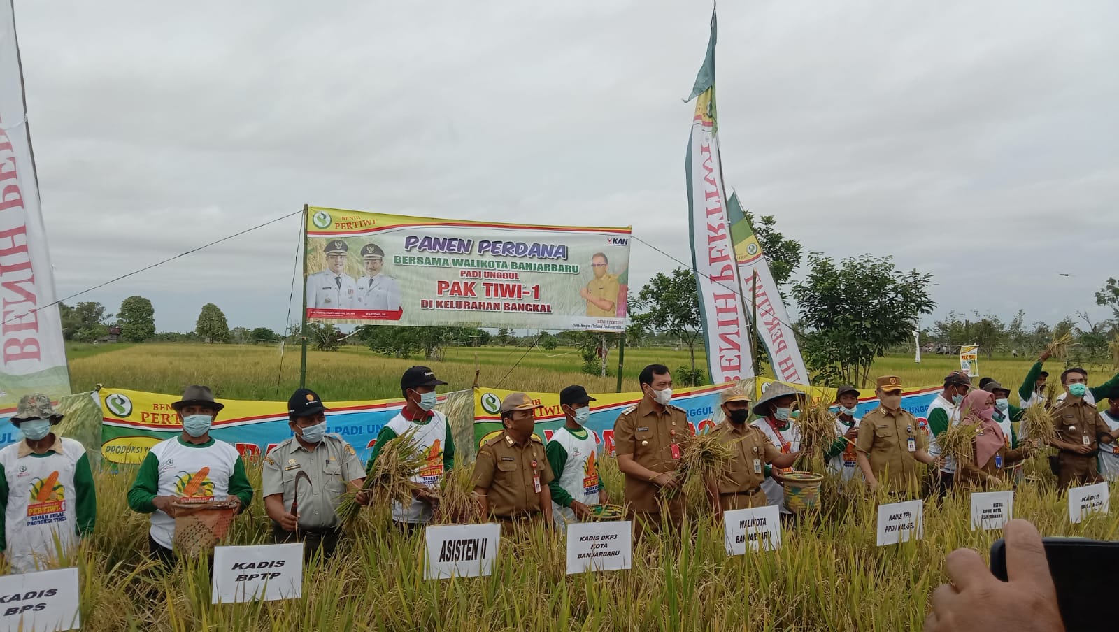 Link, Banjarbaru – Gabungan Kelompok Tani (Gapoktan) Sumber Bahagia panen raya padi unggul.