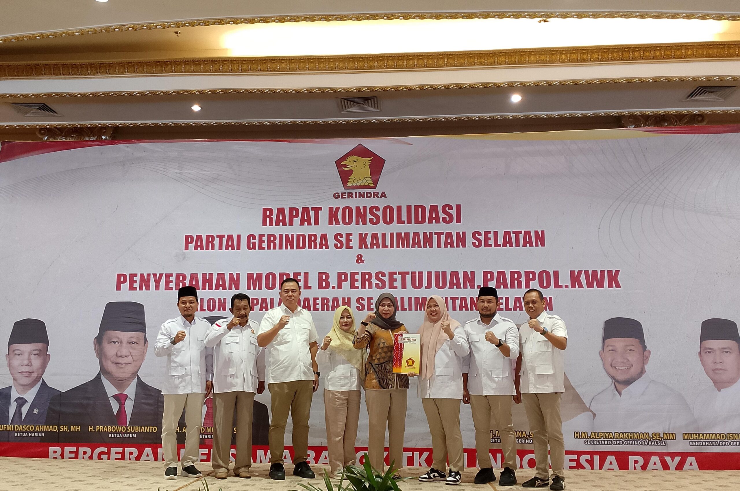 Link, Banjarbaru – Seperti sudah diketahui, Partai Gerindra di Pilkada Kota Banjarbaru 2024 telah menjatuhkan pilihan dukungan kepada Hj Erna Lisa Halaby. Kini hal itu dipertegaskan dengan diserahkannya SK dukungan B1 KWK Partai Gerindra untuk pasangan Lisa – Wartono. Penyerahan SK dukungan ini, diserahkan secara langsung oleh Ketua DPD Partai Gerindra Mariana di Qin Hotel Banjarbaru, Senin (26/8/2024).