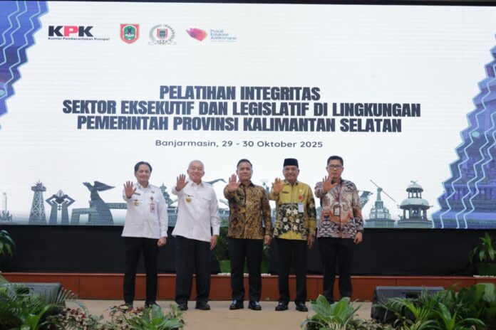 Link, Banjarmasin – Gubernur Kalimantan Selatan H Muhidin didampingi Wakil Gubernur Hasnuryadi Sulaiman, menyimak arahan dan penjelasan Deputi Bidang Koordinasi dan Supervisi KPK, Agung Yudha Wibowo terkait berbagai hal, pada pembukaan Pelatihan Integritas Sektor Eksekutif dan Legislatif di Lingkungan Pemerintah Provinsi Kalsel di Mahligai Pancasila pada Rabu (29/10/2025).