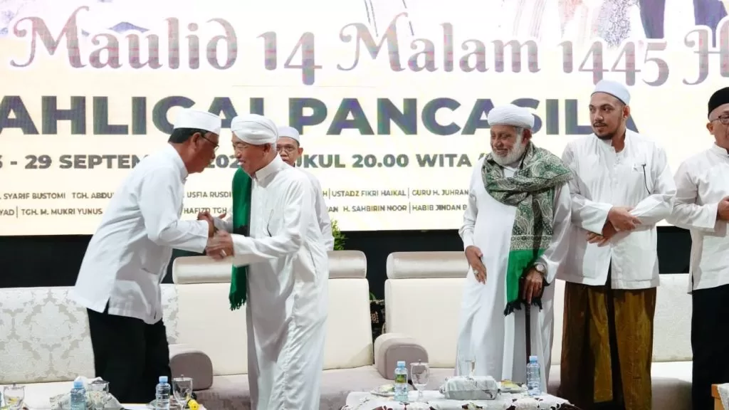 Link, Banjarmasin – Memasuki hari ketiga, rangkaian Gema Maulid 14 Malam 1445 H di Mahligai Pancasila dihadiri ratusan jemaah, Senin (18/9) malam. Acara dibuka dengan lantunan syair-syair pujian kepada Nabi Muhammad SAW, yang dibawakan dengan indah oleh Grup Habsyi As-Shofa. Ayat suci Al-Qur’an juga dilantunkan dengan syahdu pada hari ketiga ini oleh Qori’ah, Hj Noor Khalidah.