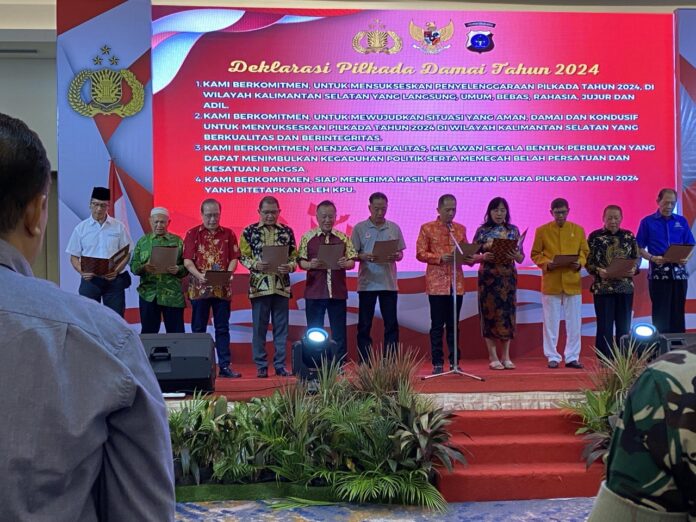 Adapun isi Deklarasi Pilkada Damai Tahun 2024 yang dibacakan bersama terdiri dari empat poin, yaitu, Pertama, Kami berkomitmen untuk menyukseskan penyelenggaraan Pilkada tahun 2024 di wilayah Kalimantan Selatan yang langsung, umum, bebas, rahasia, jujur, dan adil. Kedua, Kami berkomitmen untuk mewujudkan situasi yang aman, damai, dan kondusif untuk menyukseskan Pilkada tahun 2024 di wilayah Kalimantan Selatan yang berkualitas dan berintegritas. Ketiga, Kami berkomitmen menjaga netralitas, melawan segala bentuk perbuatan yang dapat menimbulkan kegaduhan politik serta memecah belah persatuan dan kesatuan bangsa. Keempat, Kami berkomitmen siap menerima hasil pemungutan suara Pilkada tahun 2024 yang ditetapkan oleh KPU.