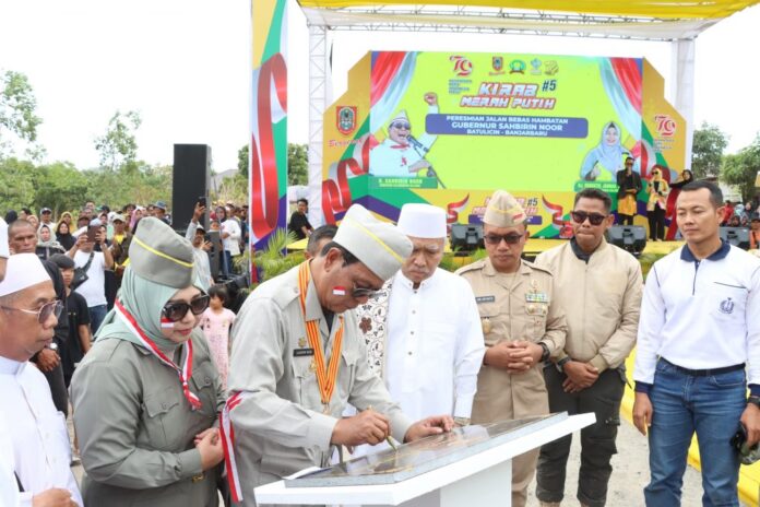 Link, Martapura – Gubernur Kalimantan Selatan (Kalsel) Sahbirin Noor didampingi Ketua Tim Penggerak PKK Kalsel, Raudatul Jannah meresmikan jalan bebas hambatan Banjarbaru-Batulicin di Jembatan awang Bangkal Kabupaten Banjar.