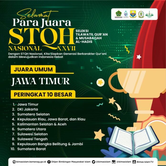 Adapun peringkat peringkat 10 besar STQH di Jambi adalah Jatim, DKI, Sumsel, Kepri, Jabar dan Riau. Lalu Kalsel dan Aceh, Sumut, Sulsel, Sulteng, Kepulauan Bangka Belitung dan Jambi serta Sumatera Barat.