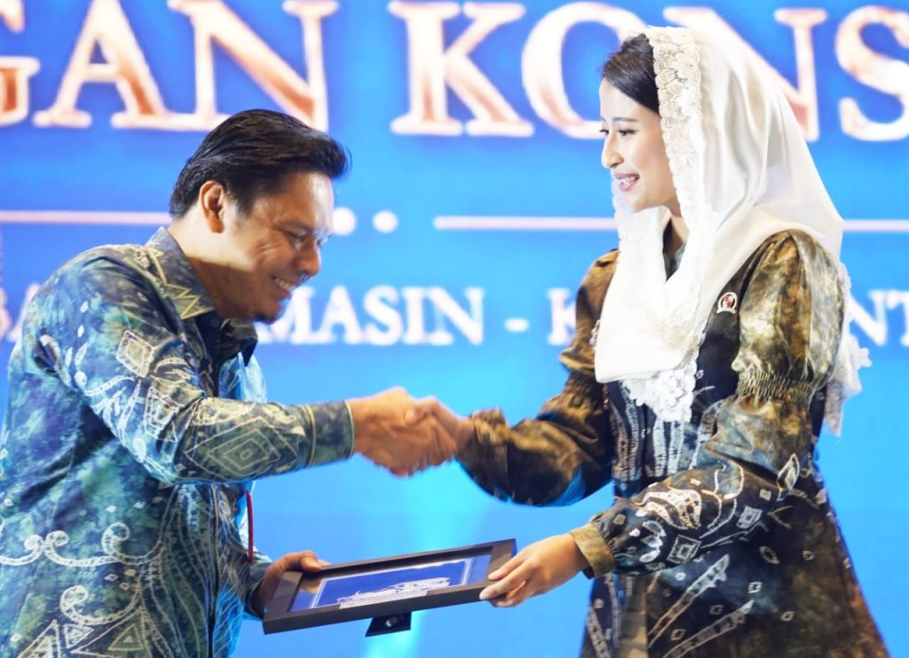 Penghargaan Perlindungan Konsumen 2024 diserahkan Wakil Menteri Perdagangan RI, Dyah Roro Esti Widya Putri kepada di Plh Gubernur Kalsel, Roy Rizali Anwar. Hotel Fugo Banjarmasin, Senin (18/11/2024).