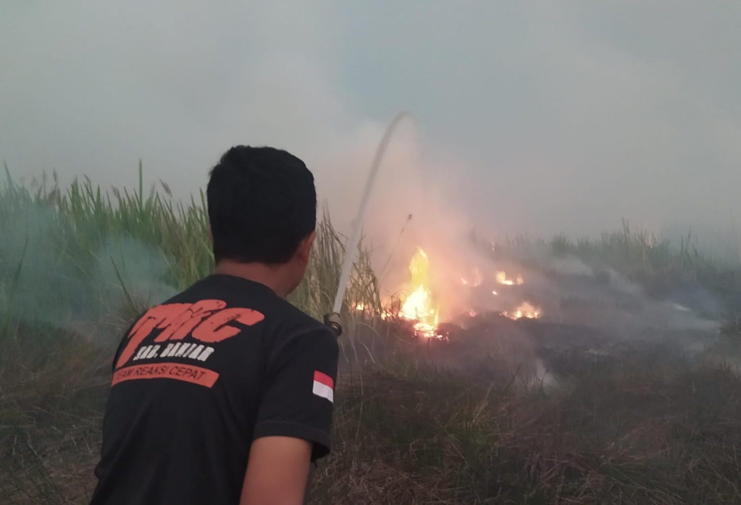 “ Luasan lahan yang terbakar sekitar 3 hektare, namun api belum padam, kita kesulitan menjangkau titik api yang semakin menjauh, berada di tengah-tengah” ujar Pamula salah satu petugas BPBD Banjar.