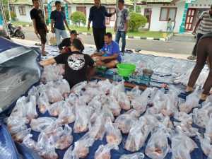 Mereka duduk sejajar tanpa melihat pangkat dan jabatan disibukkan dengan tumpukan daging sapi yang harus dipotong-potong. Kemudian potongan daging ditimbang dan dimasukkan dalam bungkusan. Selanjutnya siap untuk dibagikan. (wahyu/BBAM)