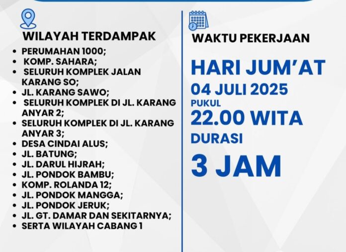 Link, Banjarbaru – Tidak hanya terjadi di wilayah Gubernur Syarkawi, gangguan distribusi air juga terjadi di wilayah Jalan Karang Anyar 3. Ini, dikarenakan akan dilaksanakan pekerjaan koneksi pipa 500×150 di jl. Karanganyar 3 depan perumahan 1000, sehingga menyebabkan suplai air ke pelanggan PT. Air Minum Intan Banjar terhenti sementara, Jumat (4/7/2025).