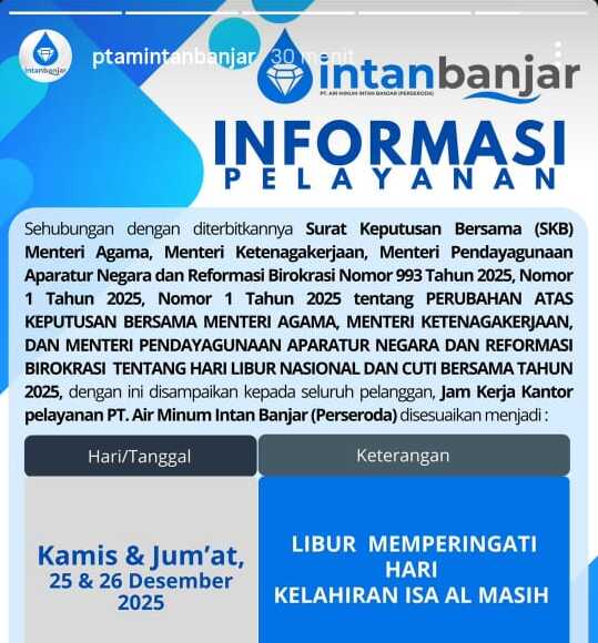 Link,Banjarbaru – PT Air Minum Intan Banjar (Perseroda) mengumumkan penyesuaian jadwal pelayanan kantor sehubungan dengan libur nasional Hari Kelahiran Isa Al Masih (Natal) Tahun 2025.