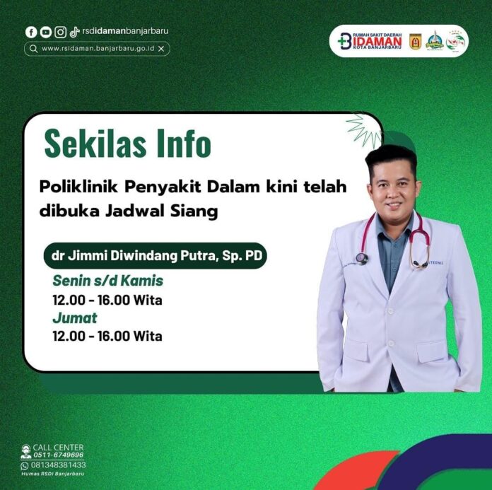 Link, Banjarbaru- Angka kunjungan pada Poliklinik Penyakit Dalam Rumah Sakit Daerah (RSD) Idaman Kota Banjarbaru, yang terhitung tinggi. Kini, Poliklinik Penyakit Dalam membuka layanan pada siang hari.