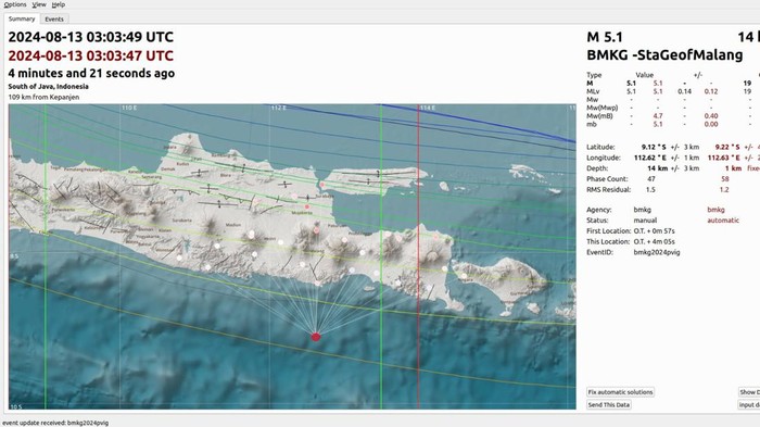 Gempa tektonik berkekuatan M 5,1 mengguncang perairan Kabupaten Malang, Selasa (13/8/2024).