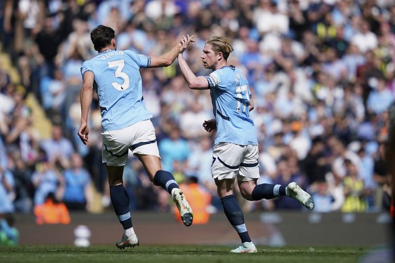 Namun, sang juara bertahan merespons dengan cepat. De Bruyne memperkecil ketertinggalan lewat tendangan bebas indah pada menit ke-31. Tiga menit berselang, gelandang Belgia itu berperan dalam terciptanya gol penyeimbang yang dicetak Marmoush.