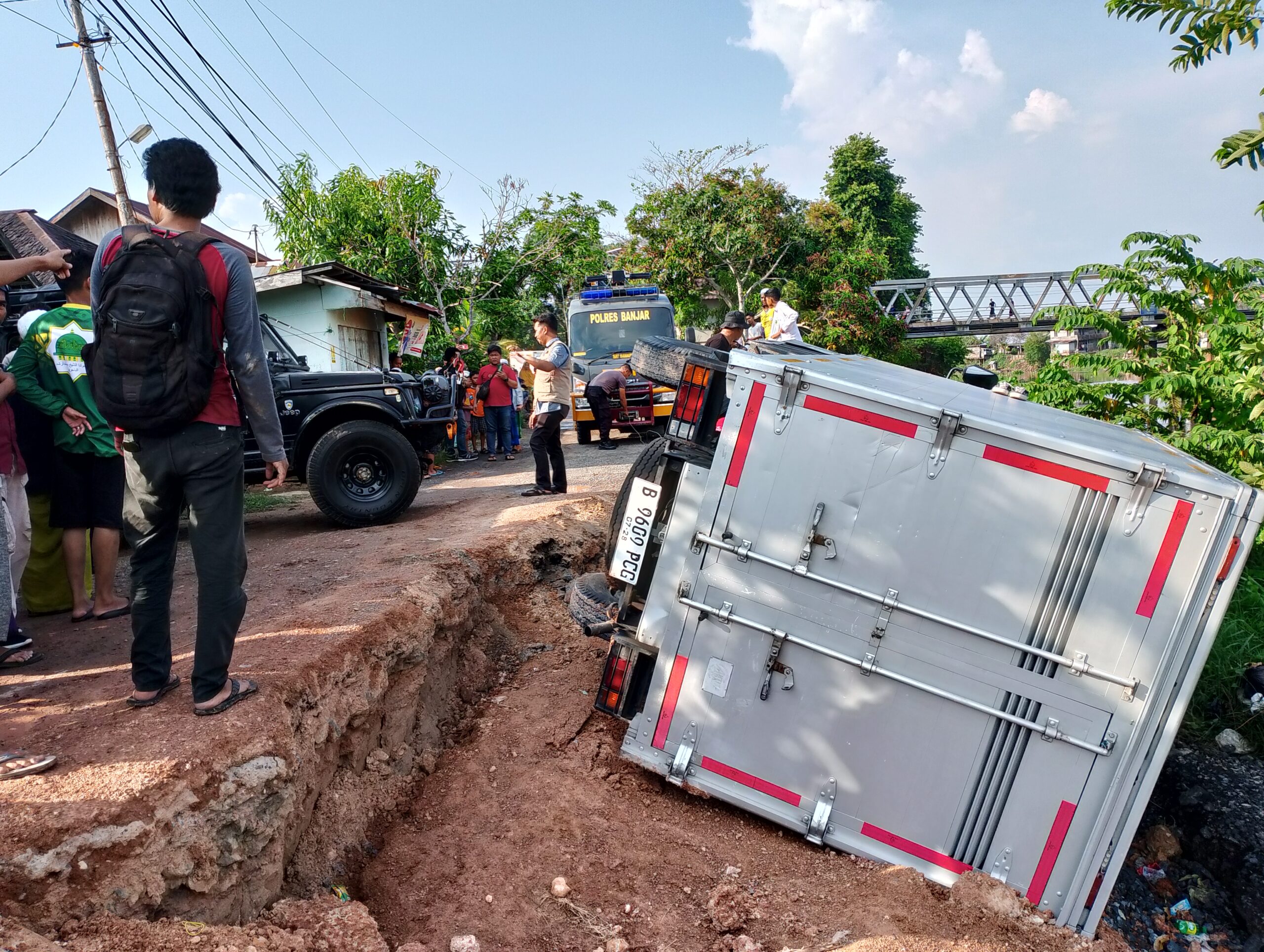 Setelah hampir satu jam, akhirnya bantuan datang dari Polisi Resor (Polres) Kabupaten Banjar. Dengan membawa alat derek, guna merescue mobil box tersebut. Hampir 20 menit berlalu, proses pengangkatan mobil box tersebut masih berlangsung.