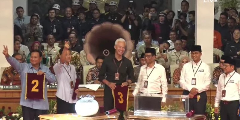 Komisi Pemilihan Umum RI melakukan pengundian nomor urut Pilpres 2024. Pengambilan undian nomor urut dilakan dua tahap.