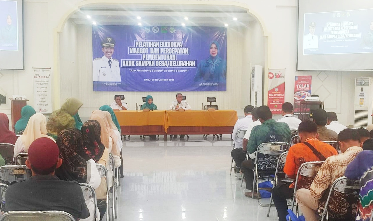 Link, Martapura – Kelola limbah organik menjadi produk bernilai ekonomis. Pemerintah Kabupaten (Pemkab) Banjar melalui Dinas Perumahan Rakyat Kawasan Permukiman dan Lingkungan Hidup (DPRKPLH) gelar Pelatihan Budidaya Maggot dan Percepatan Pembentukan Bank Sampah Desa/Kelurahan ,di Aula Wisma Sultan Sulaiman BKPSDM pada Rabu (26/11/2025) pagi.