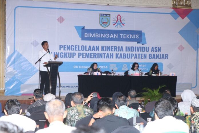 Link, Banjarbaru – Bupati Banjar H Saidi Mansyur membuka Bimbingan Teknis (Bimtek) Pengelolaan Kinerja Pegawai ASN lingkup Pemerintah Kabupaten Banjar di Ballroom Hotel Grand Qin, Banjarbaru Jumat (6/12/2024) pagi.