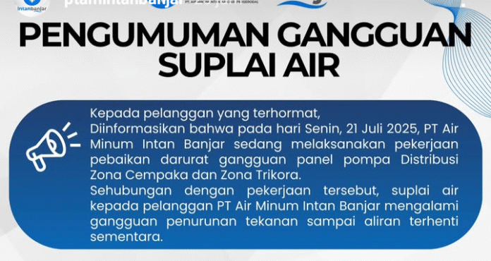 Link, Banjarbaru – Lakukan perbaikan darurat panel pompa distribusi di Zona Trikora dan Zona Cempaka, PT Air Minum (PTAM) Intan Banjar (Perseroda) mengumumkan adanya gangguan suplai air bersih di sejumlah wilayah. Gangguan ini mengakibatkan penurunan tekanan hingga aliran air terhenti sementara.