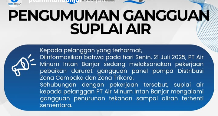 Manajemen PT Air Minum Intan Banjar menyampaikan permohonan maaf atas ketidaknyamanan yang ditimbulkan. Pelanggan diimbau untuk menampung air secukupnya sebelum pekerjaan dimulai. (wahyu)