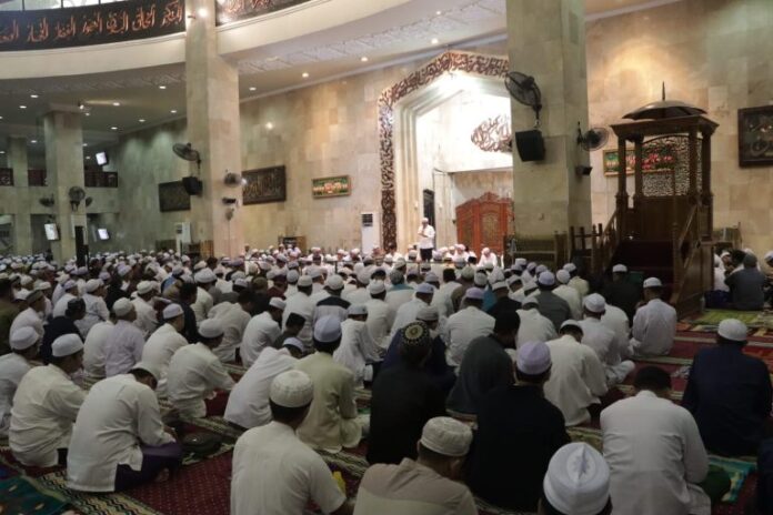 Ribuan jemaah yang memadati ruang induk dan halaman Mesjid Raya Sabilal Muhtadin, mendengarkan dengan seksama ceramah yang disampaikan Ustadz Ilham Humaidi.