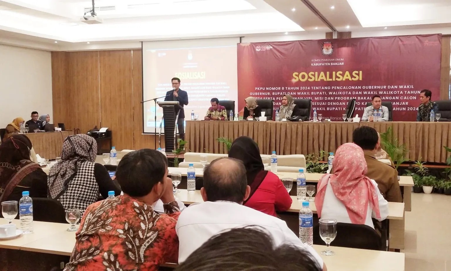 Link, Martapura – Jelang pelaksaan pemilihan kepala daerah (Pilkada) serentak 2024, Komisi Pemilihan Umum (KPU) Kabupaten Banjar gelar sosialisasi PKPU No 8 Tahun 2024 tentang pencalonan Bupati dan Wakil Bupati Kabupaten Banjar.