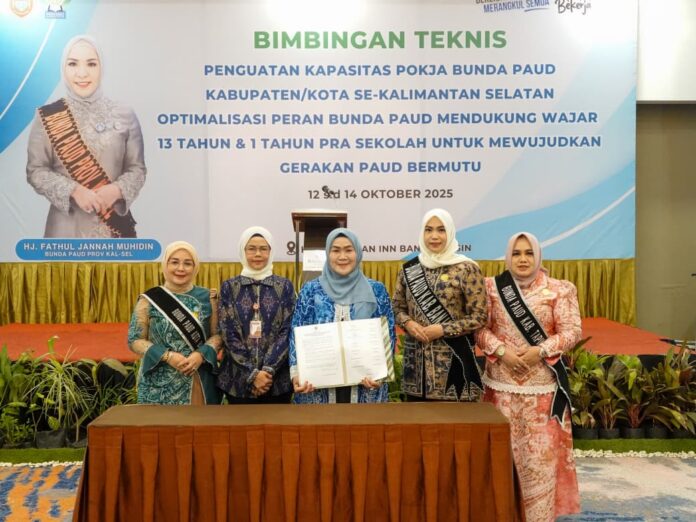 Optimalisasi Peran Bunda PAUD Mendukung Wajib Belajar (Wajar) 13 Tahun dan 1 Tahun Pra Sekolah untuk Mewujudkan Gerakan PAUD Bermutu di Rattan Inn Banjarmasin, pada Minggu (12/10/2025) malam.