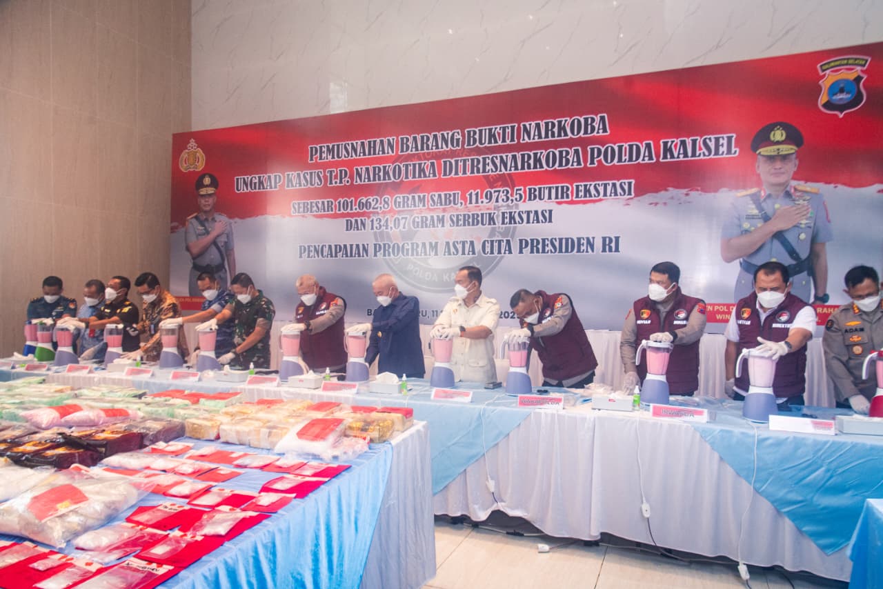 Barang bukti yang dimusnahkan dengan cara diblender terdiri dari 101,6 kilogram sabu, 11.973 butir ekstasi, dan 134 gram serbuk ekstasi, hasil pengungkapan besar aparat kepolisian dalam beberapa bulan terakhir.