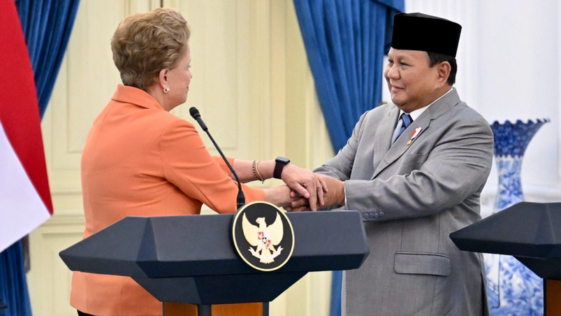 “Hari ini kita mendapat kehormatan kunjungan dari Yang Mulia Ibu Dilma Rousseff, yang sekarang adalah Presiden dari New Development Bank (NDB) dan beliau adalah mantan Presiden Brazil Tahun 2011–2016, juga beliau mantan Menteri Energi Brazil, dan juga mantan Sekretaris Kabinet Presiden Lula da Silva 2005–2010,” ujar Presiden Prabowo saat menyampaikan keterangan pers bersama usai pertemuan dengan Presiden NDB Dilma Vana Rousseff di Istana Merdeka, Jakarta, pada Selasa, 25 Maret 2025..