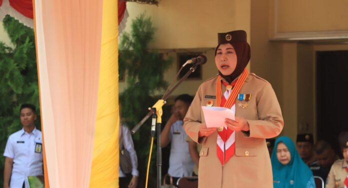 Selaku Pembina Upacara, Acil Odah membacakan pidato tertulis Ketua Kwartir Nasional Gerakan Pramuka Komjen Pol (Purn) Drs. Budi Waseso.
