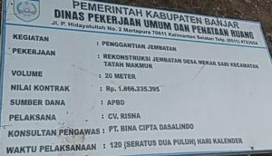 Untuk diketahui, pembangunan jembatan tersebut dari papan proyek diketahui dibiayai melalui APBD Kabupaten Banjar tahun 2021 dengan nilai Rp 1,8 miliar lebih. Tertulis juga CV Risna sebagai kontraktor pelaksananya.