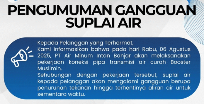 Link, Banjarbaru – PT Air Minum (PTAM) Intan Banjar mengumumkan akan melakukan pekerjaan koneksi pipa transmisi air curah Booster Muslimin pada Rabu, 6 Agustus 2025 pukul 21.00 WITA. Pekerjaan tersebut diperkirakan berlangsung selama dua jam.