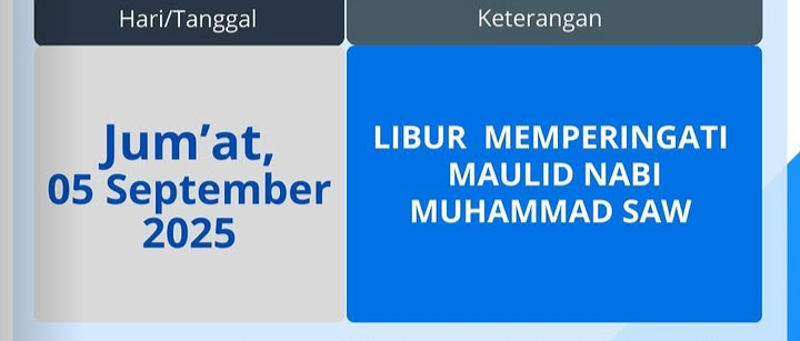 Link, Banjarbaru – Managemen PTAM Intan Banjar, umumkan Informasi Pelayanan sehubungan dengan cuti bersama peringatan Maulid Nabi Muhammad SAW, Jumat (5/9/2025). Serta, terbitnya Surat Keputusan Bersama (SKB) Menteri Agama, Menteri Ketenagakerjaan, Menteri Pendayagunaan Aparatur Negara dan Reformasi Birokrasi Nomor 993 Tahun 2025, Nomor 1 Tahun 2025, Nomor 1 Tahun 2025 tentang PERUBAHAN ATAS KEPUTUSAN BERSAMA MENTERI AGAMA, MENTERI KETENAGAKERJAAN, DAN MENTERI PENDAYAGUNAAN APARATUR NEGARA DAN REFORMASI BIROKRASI TENTANG HARI LIBUR NASIONAL DAN CUTI BERSAMA TAHUN 2025, dengan ini disampaikan kepada seluruh pelanggan, Jam Kerja Kantor pelayanan PT. Air Minum Intan Banjar (Perseroda).