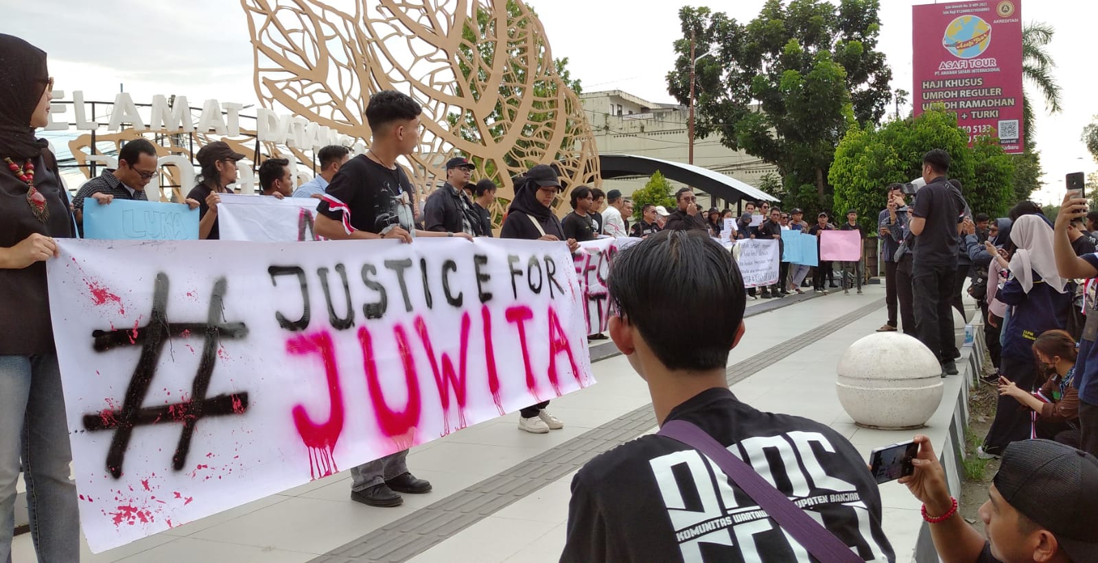 Tulisan-tulisan seperti ‘Justice For Juwita’, ‘Adili Jumran dengan Terbuka’, ‘Stop Femicide’, serta ‘Keadilan untuk Jubi, Keadilan untuk Papua’ menghiasi area demonstrasi.