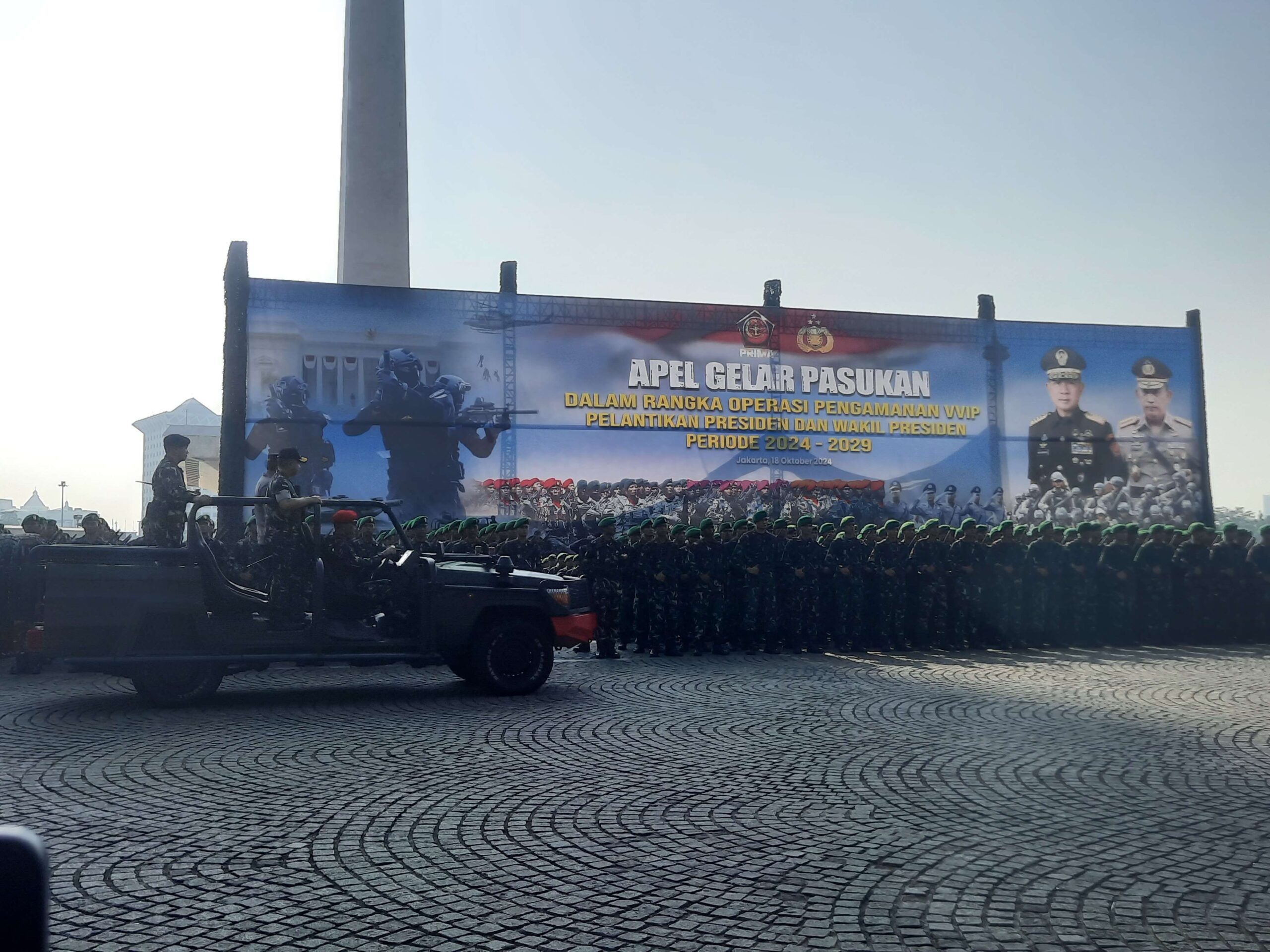 TNI Polri melakukan Apel Gelar Pasukan dalam rangka operasi pengamanan VVIP dan pelantikan presiden – wakil presiden, Kamis (18/10/2024). Apel gabungan yang berlangsung di lapangan Monas dipimpin Panglima TNI Jenderal TNI Agus Subiyanto dan Kapolri Jenderal Pol Listyo Sigit Prabowo.