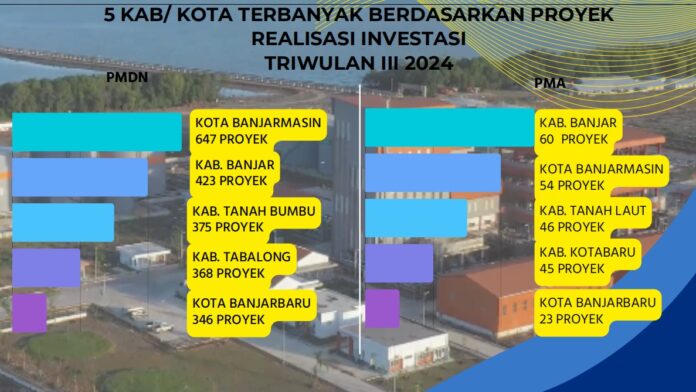 Disebutkan, realisasi PMDN tertinggi terjadi pada triwulan III 2024 ada di Kota Banjarmasin dengan nominal Rp 715 082, 20 miliar dengan 647 proyek, disusul Kabupaten Tanah Bumbu dengan realisasi Rp633.275,90 miliar dengan 375 proyek, dan Kabupaten Banjar sebesar Rp 508.165,30 miliar untuk 423 proyek.