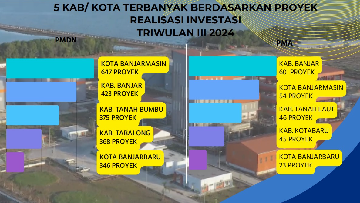 Dalam sumber data yang sama, disebutkan realisasi investasi tertinggi berdasarkan jenis usaha pada Januari – September 2024 yaitu, investasi PMDN di Kota Banjarmasin sebesar Rp2.973.888 triliun, Kabupaten Tanah Bumbu Rp2.781.408 triliun, dan Kabupaten Tapin Rp1.618.639 triliun.