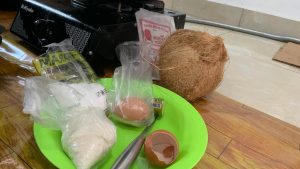 - Campurkan kelapa yang sudah diparut dengan gula, vanili dan telur ke dalam wajan.
