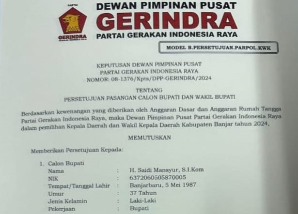 Hal tersebut diketahui setelah SK dari DPP Gerindra dengan Nomor: 08-1376/Klts/DPP-Gerindra/2024 tentang persetujuan pasangan calon (Paslon) bupati dan wakil bupati yang memutuskan H Saidi Mansyur sebagai calon bupati dan Habib Idrus Al Habsyie sebagai calon wakil bupati pada Pilkada Kabupaten Banjar 2024 beredar di jejaring WhatsApp.