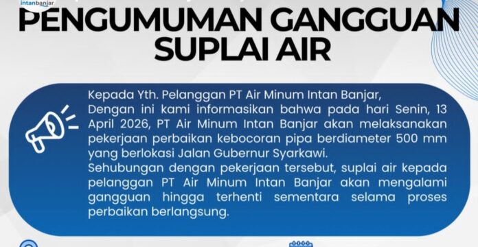 Link, Banjarbaru – Gangguan suplai air bersih, diumumkan PTAM Intan Banjar kepada para pelanggan pada Senin (13/4/2026).